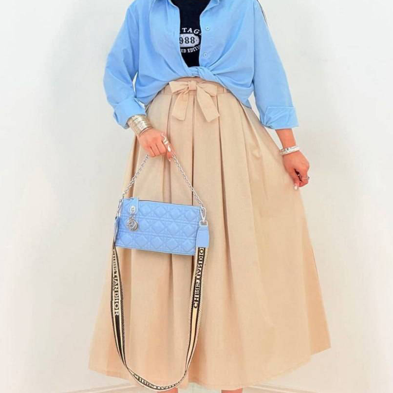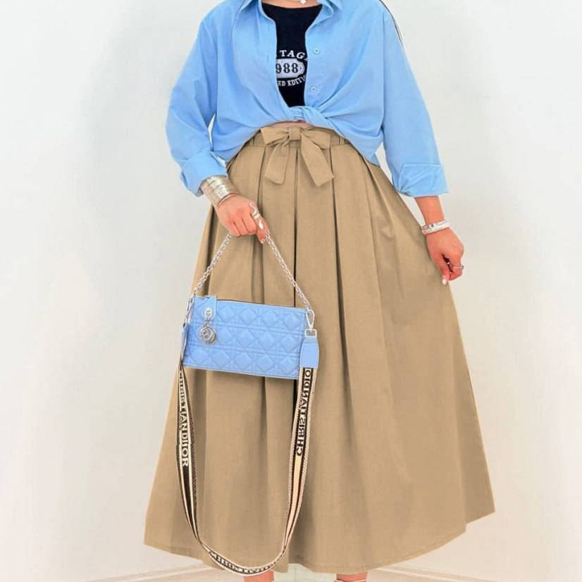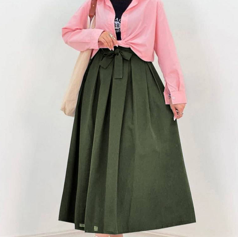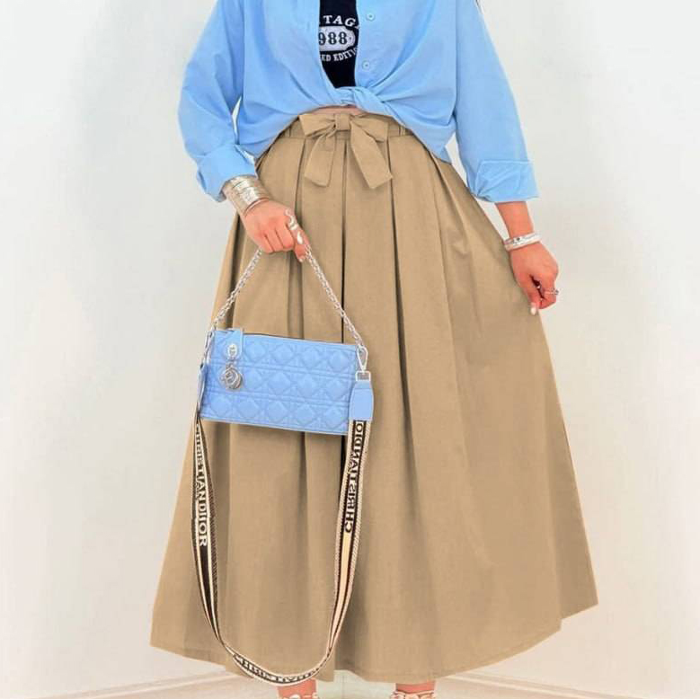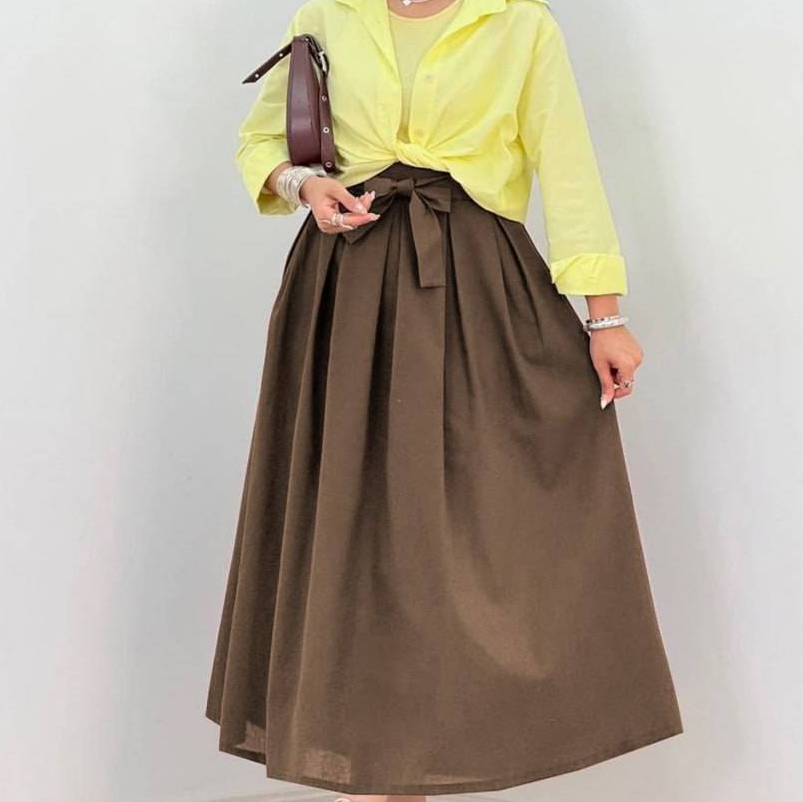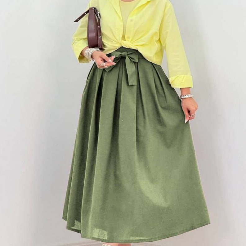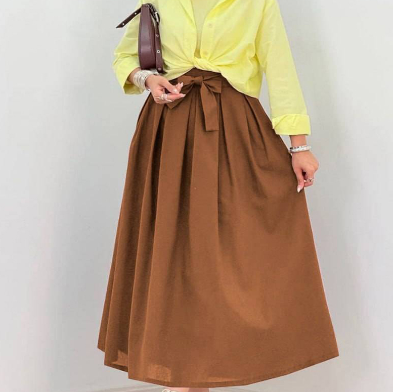 دامن کمر پاپیونی / کد : 70603 / سایز : 38 تا 42 / قد: 95 سانت / جنس : لینن ترک / بسته بندی تک سلفون / کیفیت دوخت و تن خور عالی